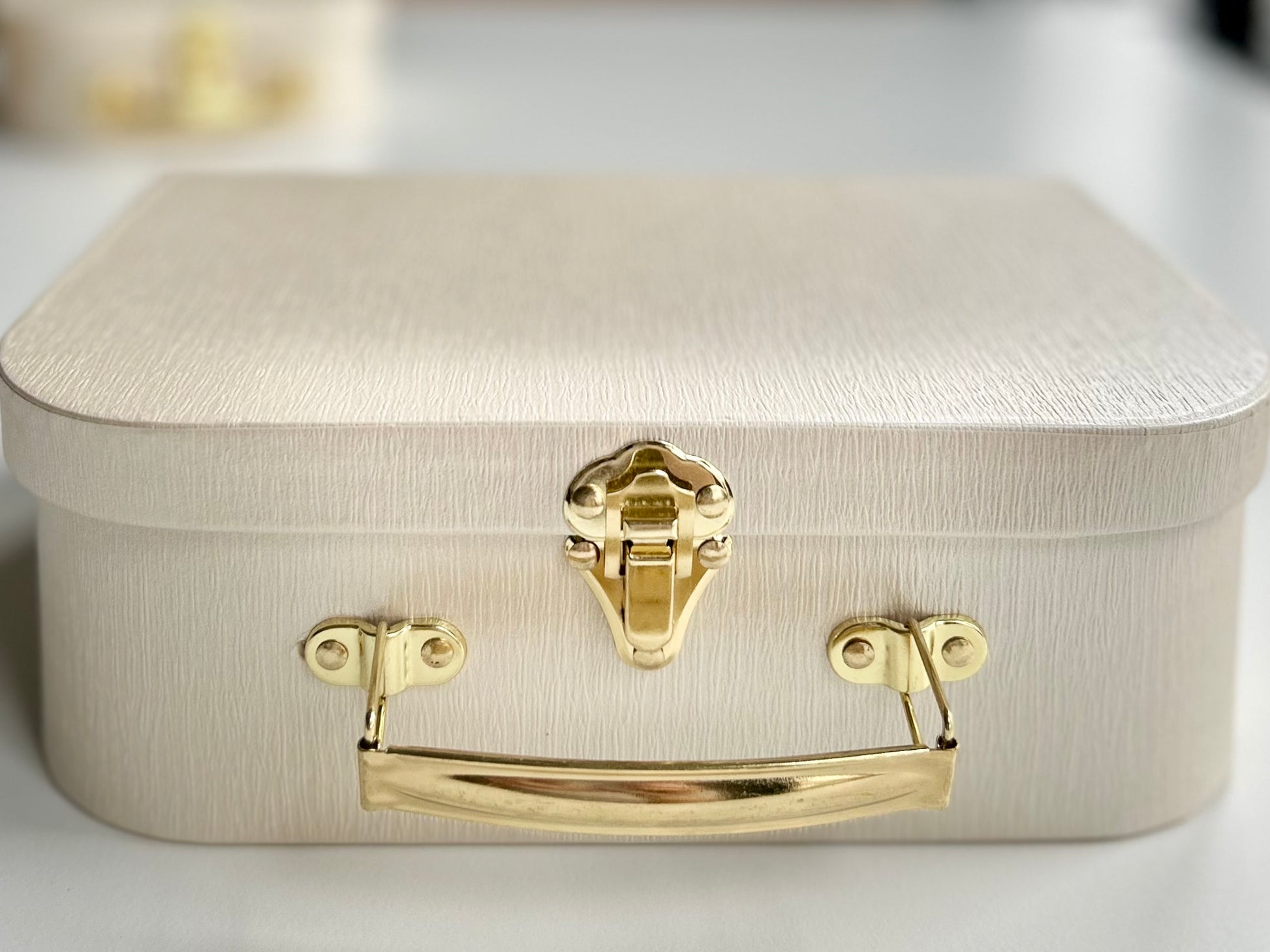 - Premium cream keepsake suitcase with gold clasp